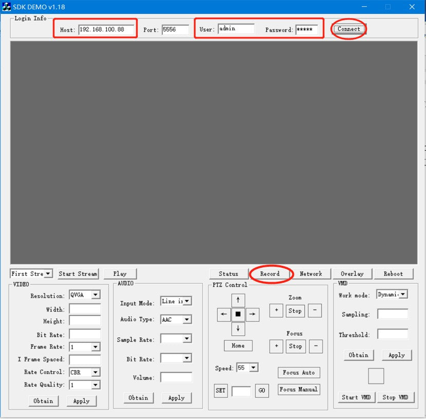 After the program runs, fill in the IP address of the camera in the Host text box, fill in the user name and password of the camera, the default is admin, and then click the "Connet" button, a successful dialog box will pop up after the connection is successful.