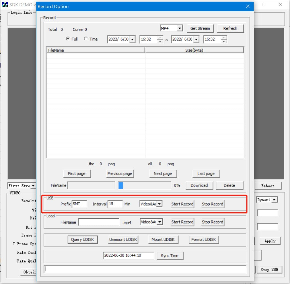 Click the "Record" button, and the "Record Option" dialog box will pop up. In the USB Group Box, you can set the prefix of the stored video, the time interval for saving the video file, the recording mode (record audio and video, only record video), and start record. and stop record.