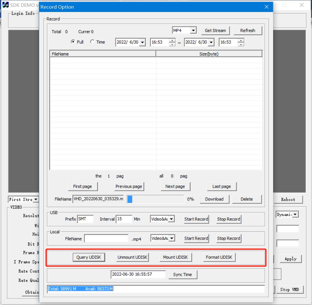Before recording a video, check the status of the USB flash drive. In the area shown below, click "Query UDISK" to check the total capacity and available capacity of the USB flash drive. If the USB flash drive is not mounted, click the "Mount UDISK" button to mount the USB flash drive. If the mount is unsuccessful, please check whether your USB flash drive is in FAT32 format with a capacity of less than 128G.
