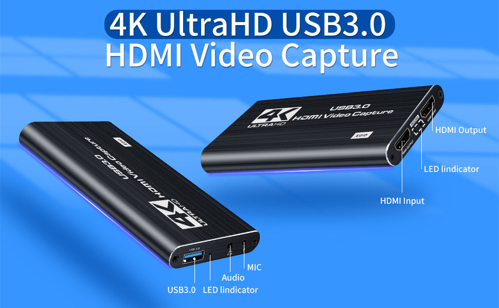 - 【HDIM to USB3.0 Video Capture Card】: Game video capture card is designed with high-end smart chip, stylish and compact by decent Aluminum Alloy shell. It can capture one HDMI 4Kp60 input, output HDIM 4Kp60 and capture 1080p60 signals. The HDMI video capture meets UVC and UAC standard, without having to install drivers and settings, the real PnP, easy to use.