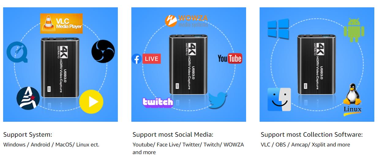 - 【Extensive compatibility&Application】: The HDMI video capture card is a good helper for high-definition capture, live broadcast,video recording, conference room, teaching recording and gameplay. Can be connected to source HDMI interface devices (such as: PS3, PS4, NS switch, XBOX, computer, laptop, DVD, HD player, etc.) Real-time game capture card for switch streaming on Twitch/Youtube/OBS/XSplit/Potplayer/Tiktok.