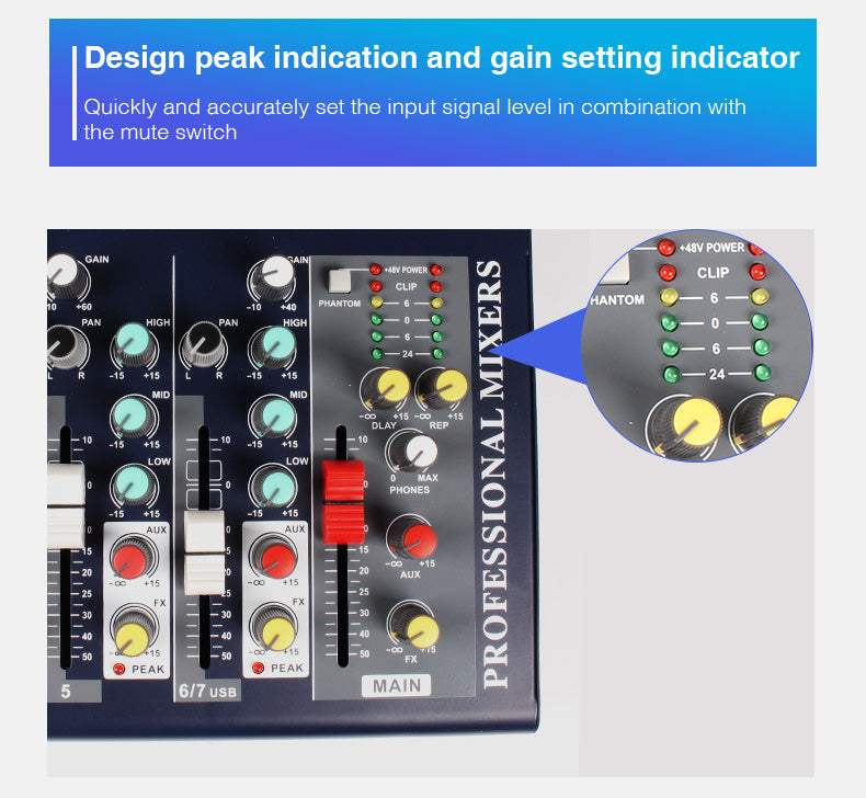 The design of peak indication and gain setting indicator combined with mute switch can quickly and accurately set the incoming and outgoing signal level.