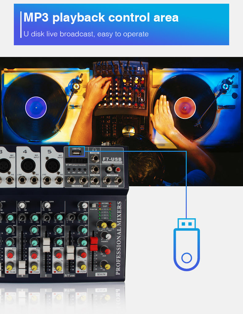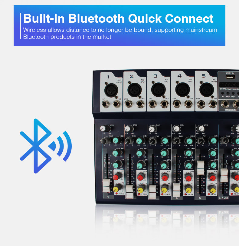 Built in Bluetooth fast connection, wireless distance is no longer bound, and supports mainstream Bluetooth products in the market.MP3 playback control area U disc live broadcast is applicable and easy to operate.