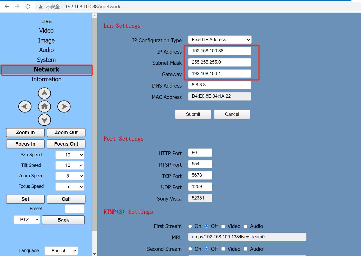 Auf der Registerkarte „NETZWERK“ der WebUI der Kamera können Sie die IP-Adresse , die Subnetzmaske und das Gateway der Kamera ändern. Klicken Sie anschließend auf „ Senden “ und starten Sie die Kamera neu (aus- und wieder einschalten).