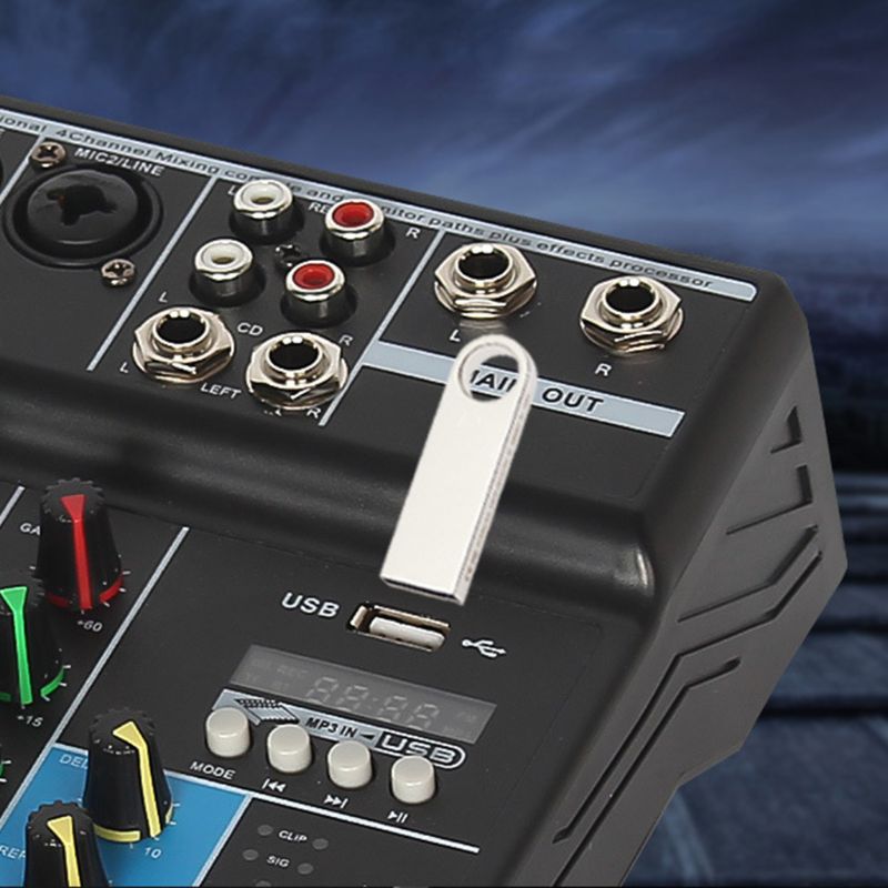 The mixer is equipped with input gain and high and low bass adjustment, built-in 48V phantom power supply for direct power supply of condenser microphones, high-definition headset output port, MP3 player, Bluetooth receiver, with connected PC sound card.